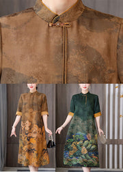 Fitted Yellow Zippered Stand Collar Chinese Style Silk Dress Short Sleeve