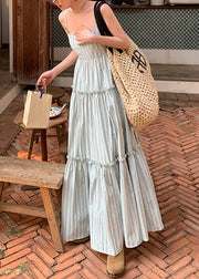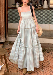 Elegant Striped Ruffled High Waist Cotton Spaghetti Strap Dress Sleeveless