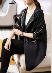 Loose Black Hooded Pockets Patchwork Cotton Trench Coat Long Sleeve