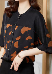 Boutique Ginkgo Leaf O Neck Patchwork Print Silk Shirt Summer