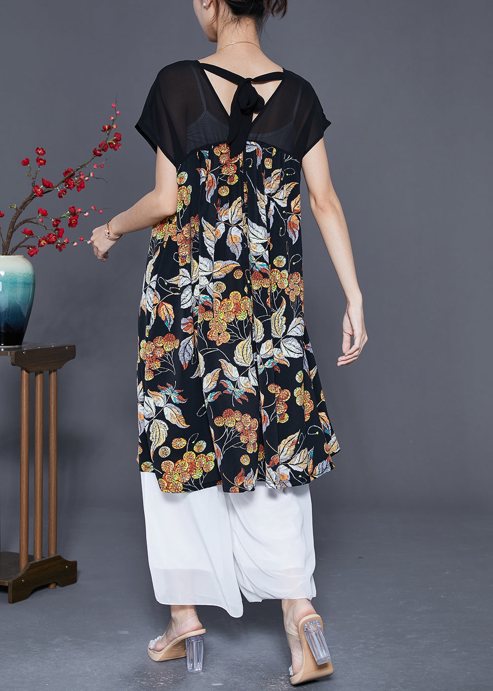 Khaki Patchwork Chiffon Long Dress Leaf Print Summer