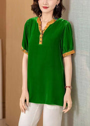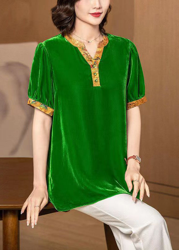 New Green V Neck Print Patchwork Silk Velour Blouses Short Sleeve