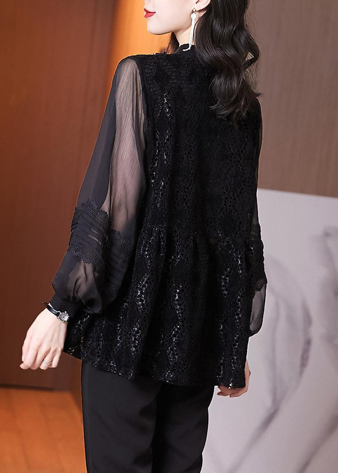 Women Black Embroideried Hollow Out Patchwork Lace Top Lantern Sleeve