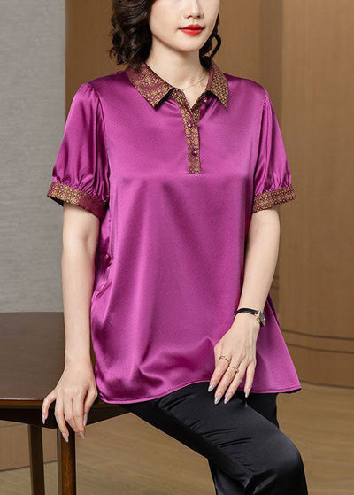 Beautiful Purple Peter Pan Collar Button Patchwork Silk T Shirt Summer