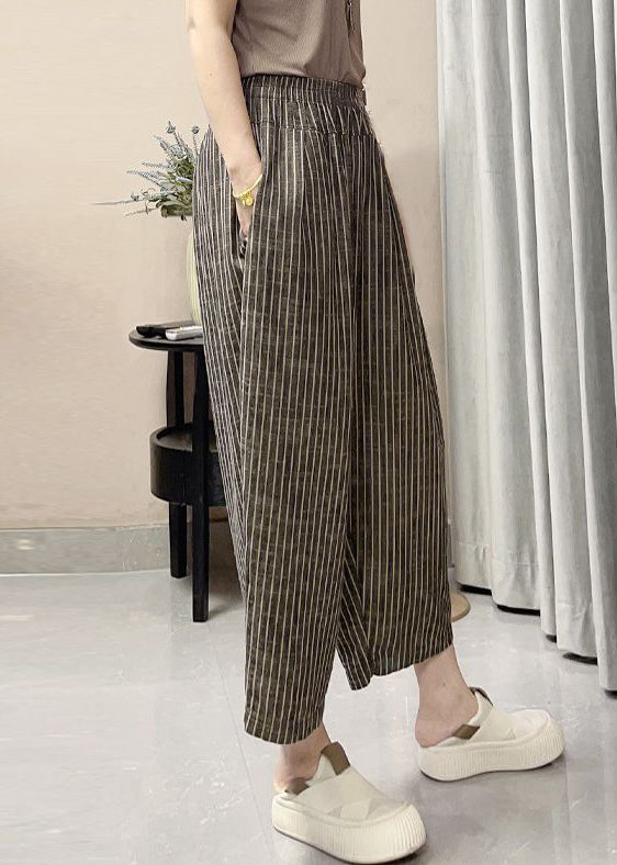 French Striped Pockets Elastic Waist Cotton Crop Pants Summer