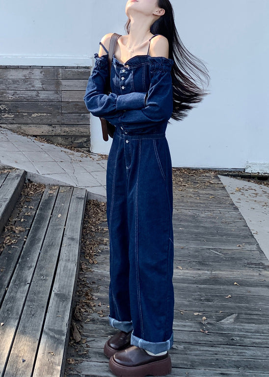 French Denim Blue Cold Shoulder Button Pockets Spaghetti Strap Jumpsuits Sleeveless