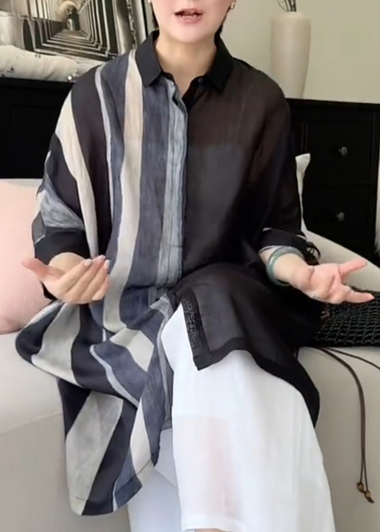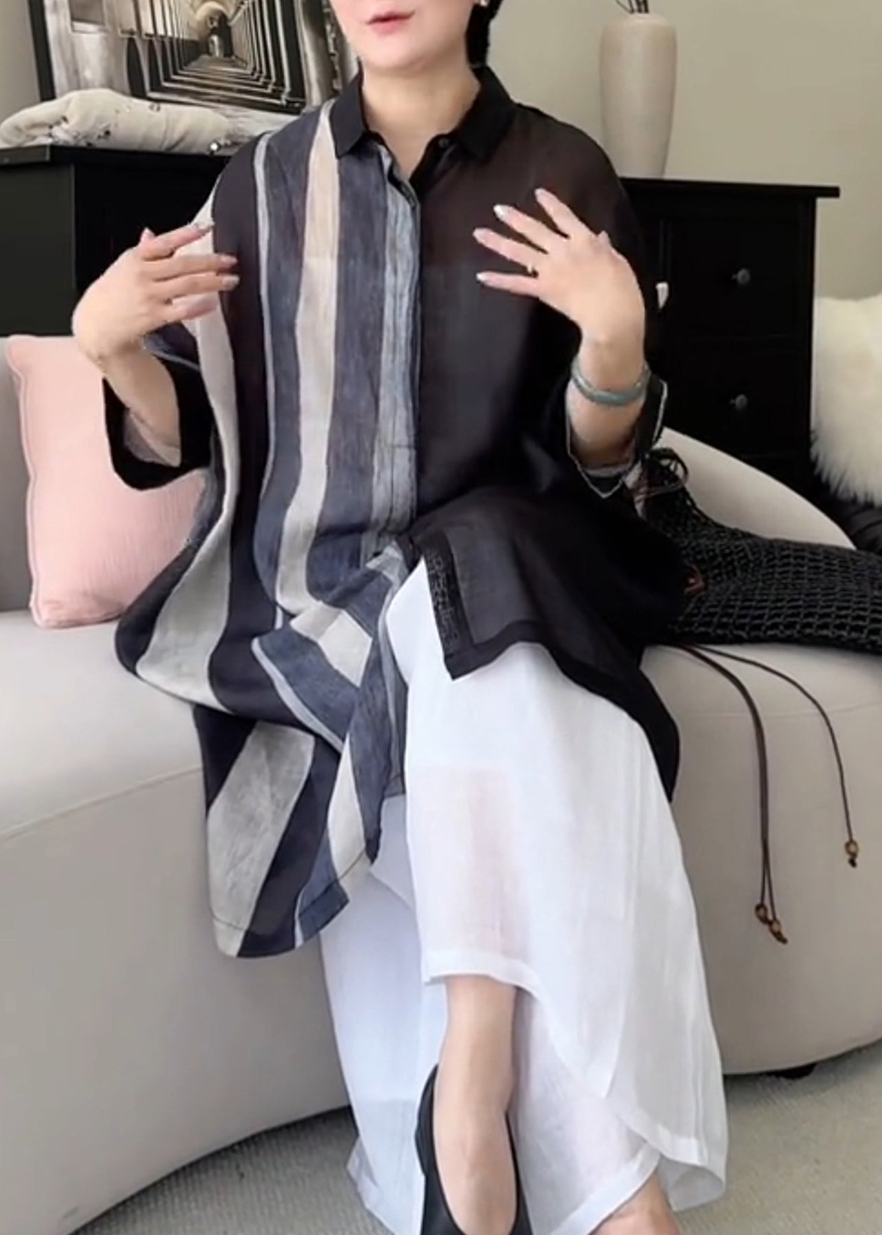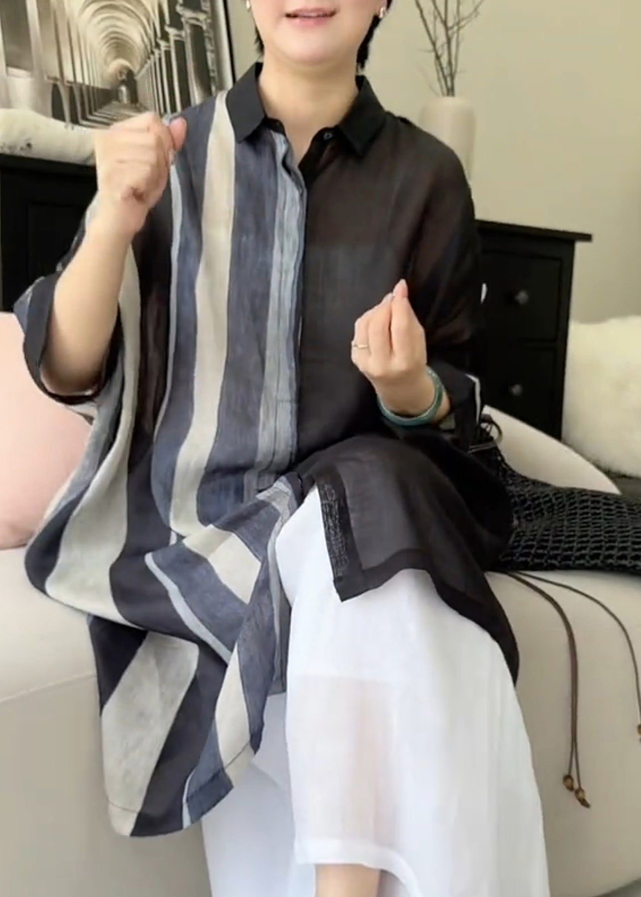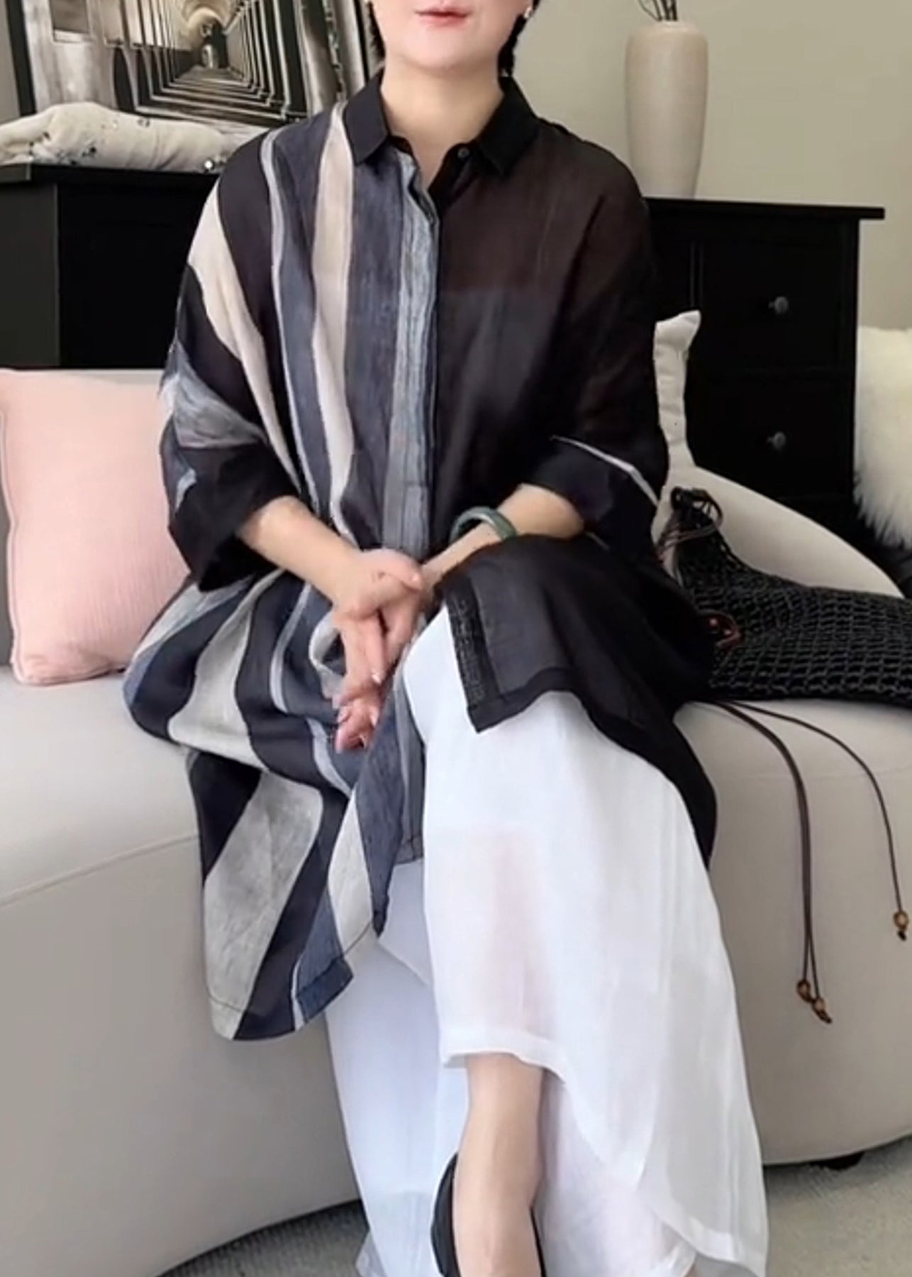 Loose Black Peter Pan Collar Striped Cotton Shirt Top Summer