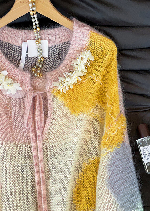 Art Gradient Color Lace Up Hollow Out Knit Top Fall