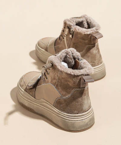 Lace Up Splicing Platform Boots Khaki Faux Leather Fuzzy Wool Lined