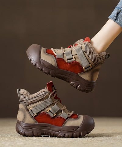 Red Cowhide Leather Boots Fuzzy Wool Lined Splicing Lace Up