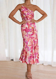 Chic Pink Asymmetrical Print Cotton Spaghetti Strap Dress Sleeveless