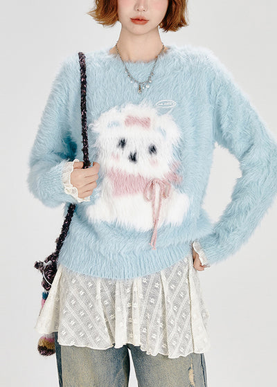 French Blue Oversized Cute Cat Faux Mink Hair Knitted Sweaters Winter