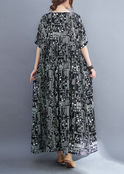 Baggy Black Wrinkled Patchwork Print Exra Large Hem Cotton Long Dress Short Sleeve