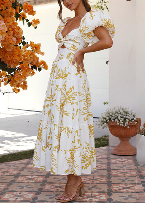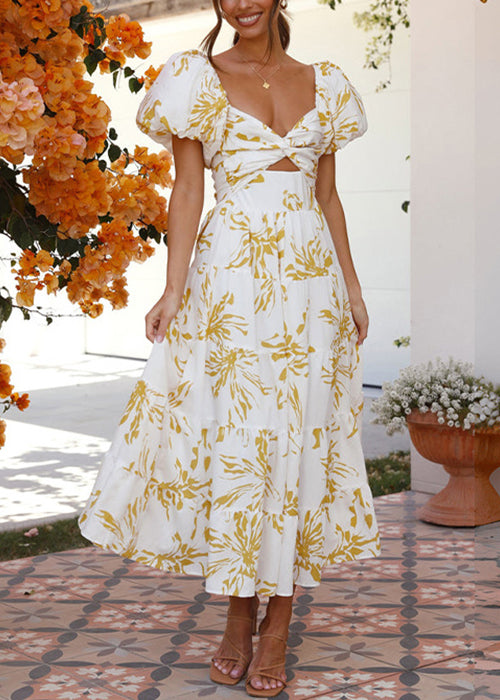 Bohemian Yellow Print Hollow Out Cotton Long Dress Summer