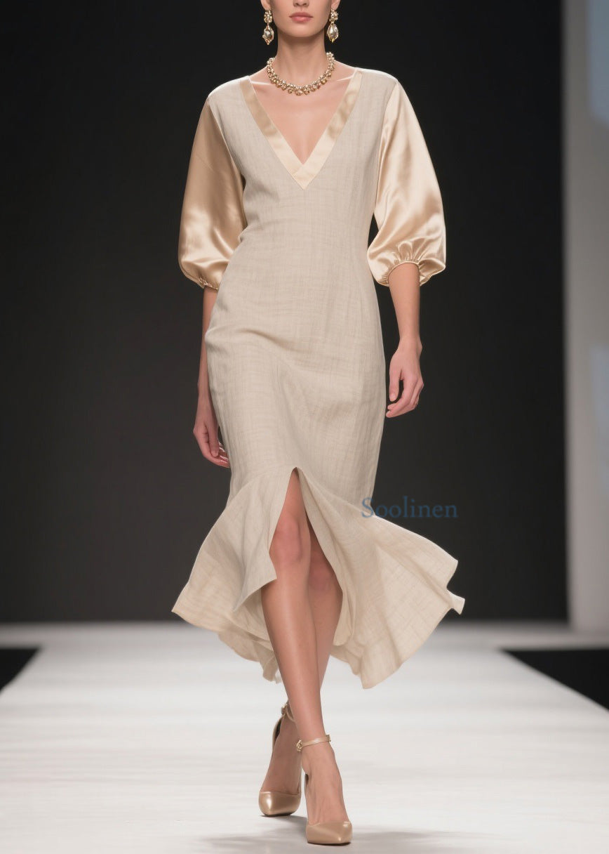 Simple V Neck Side Open Patchwork Linen Silk Dress Summer