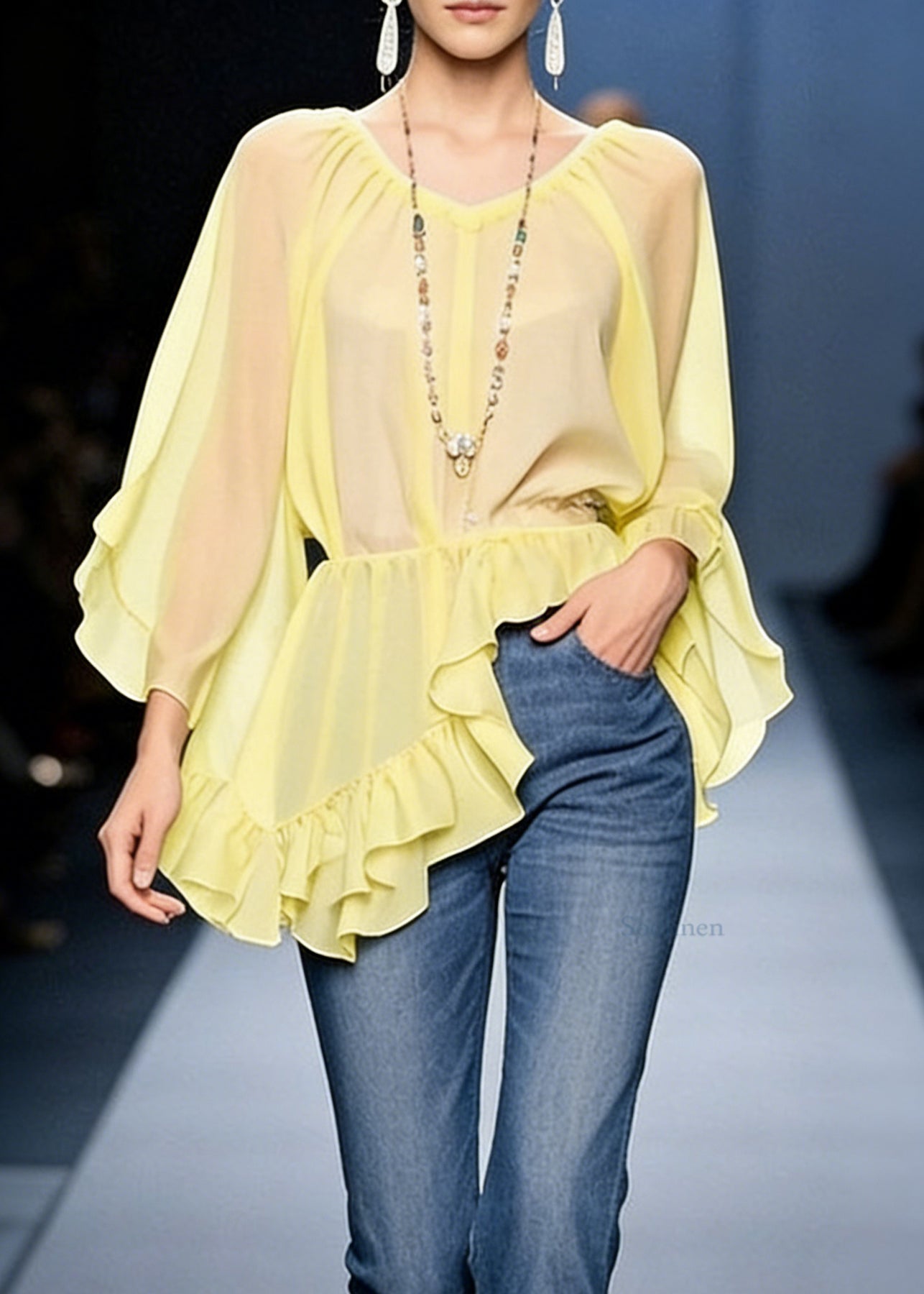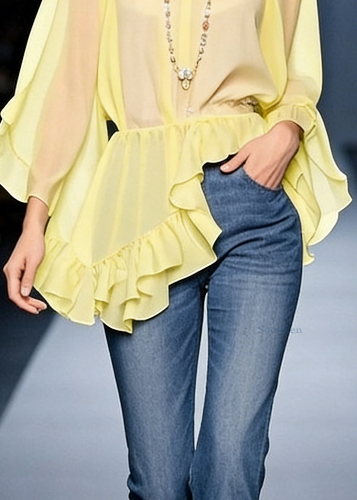 Art Yellow Asymmetrical Ruffled Solid Chiffon Blouses Spring