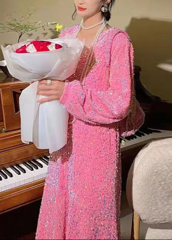 Boutique Pink V Neck Sequins Patchwork Velour Dresses Puff Sleeve