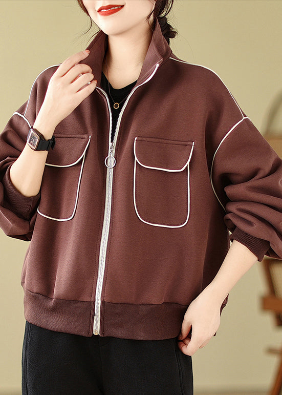 Stylish Coffee Zip Up Pockets Cotton Jacket Spring