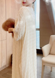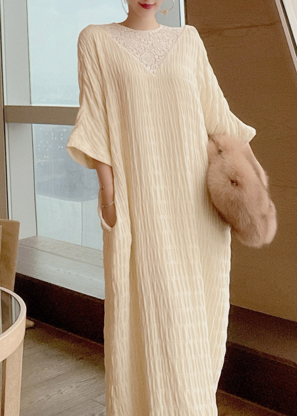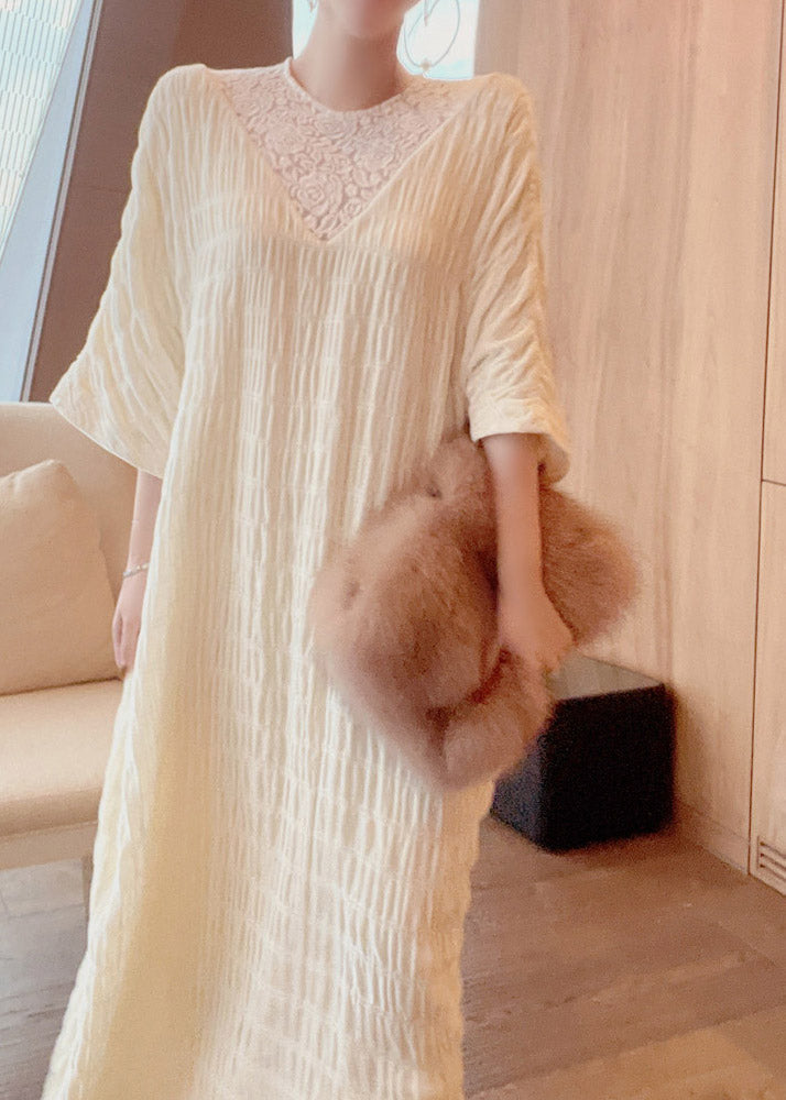 French Apricot O-Neck Lace Patchwork Silk Maxi Dresses Long Sleeve