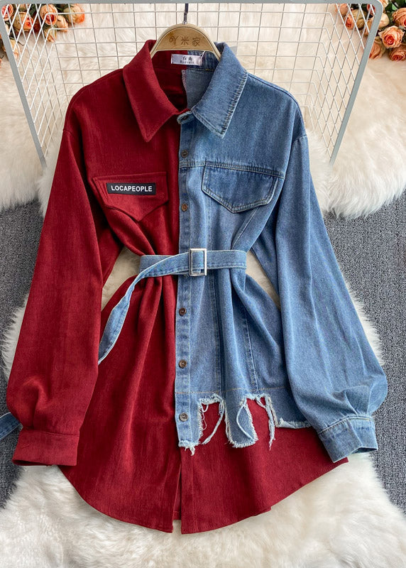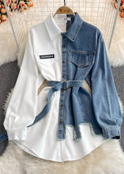 Modern Ginger Peter Pan Collar Asymmetrical Denim Patchwork Sashes Button Shirts Long Sleeve