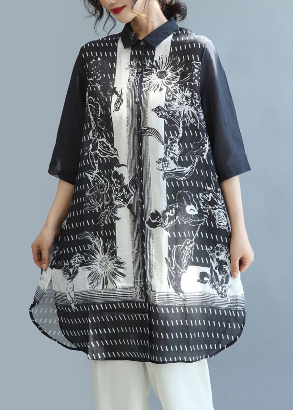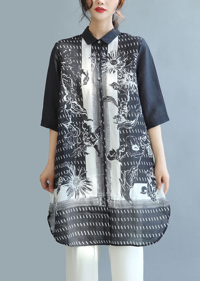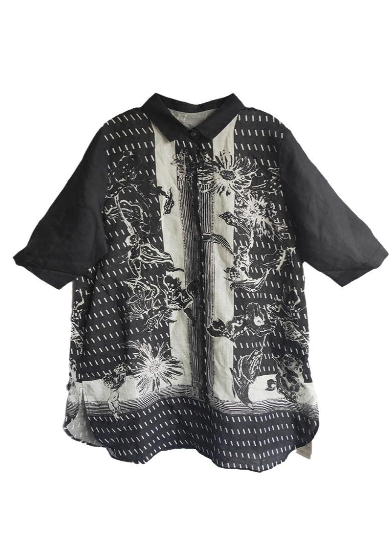 Bohemian Black Peter Pan Collar Print Linen Long Shirt Tops Half Sleeve