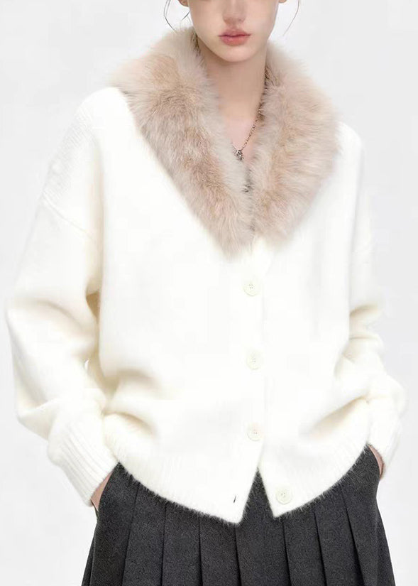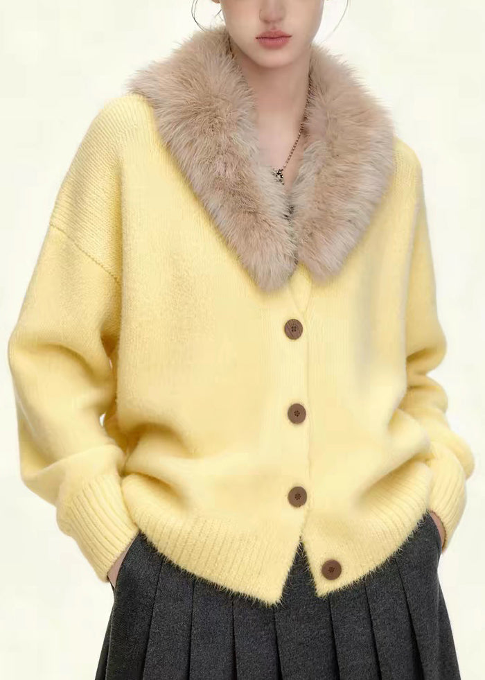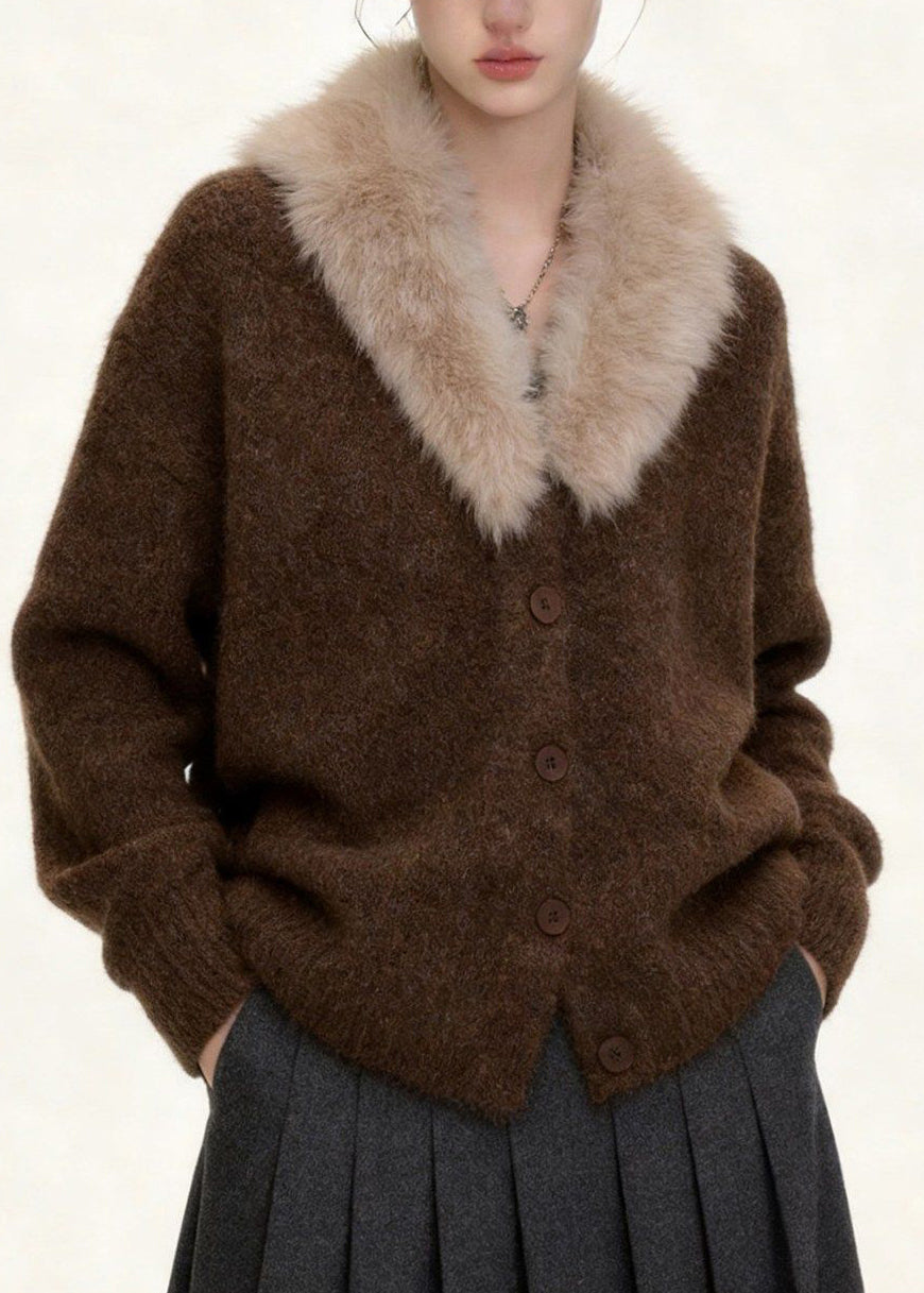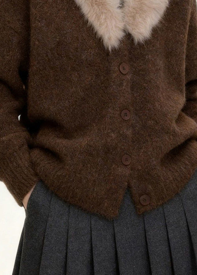 Women Coffee Fur Collar Button Patchwork Knit Coats Spring