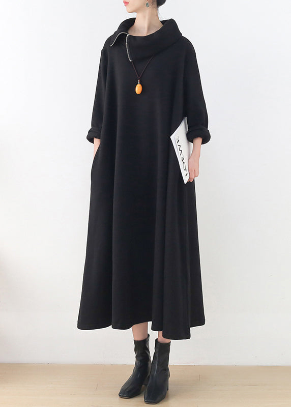 Black Turtleneck Pockets Cotton Maxi Dress Long Sleeve