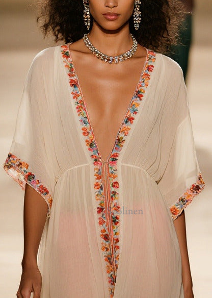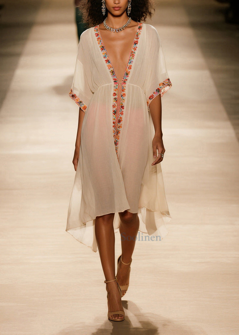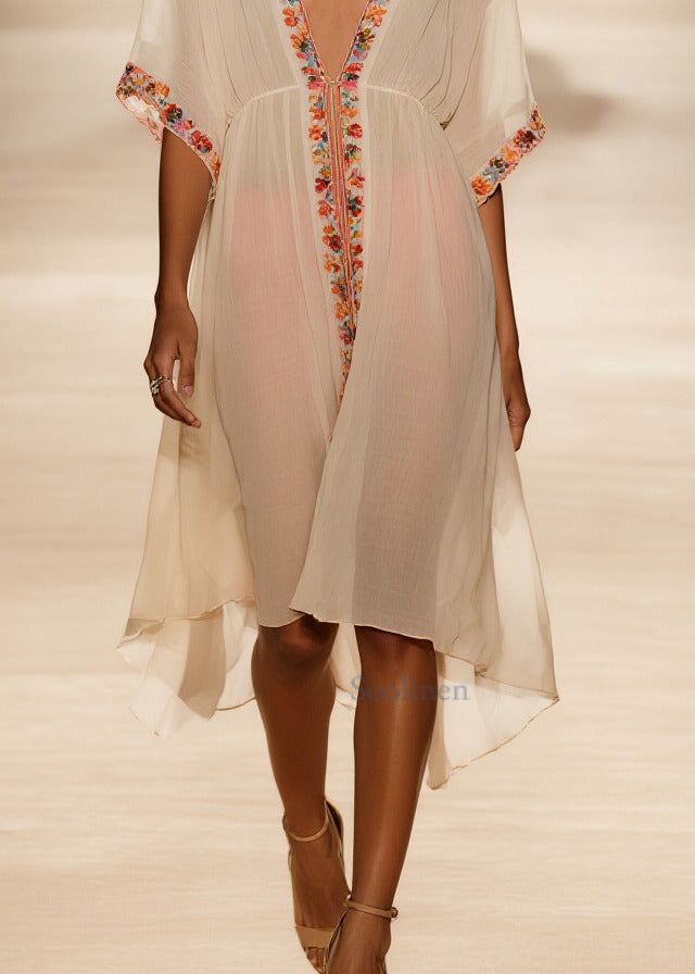 Style Apricot V Neck Floral Cotton Vacation Dresses Summer
