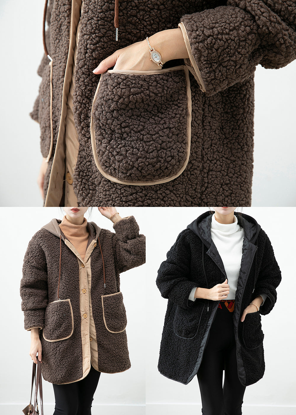 Black Patchwork Teddy Faux Fur Jacket Hooded Pockets Winter