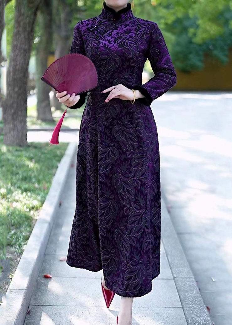 New Purple Fur Collar Button Patchwork Fleece Dress Long Sleeve