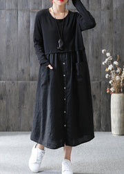 100% cotton Tunic Omychic Cotton Solid Spliced Female Long Sleeve Black Dress - SooLinen