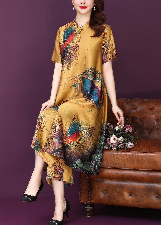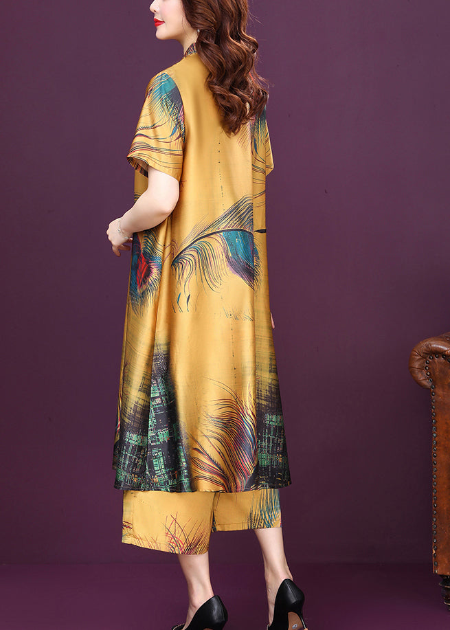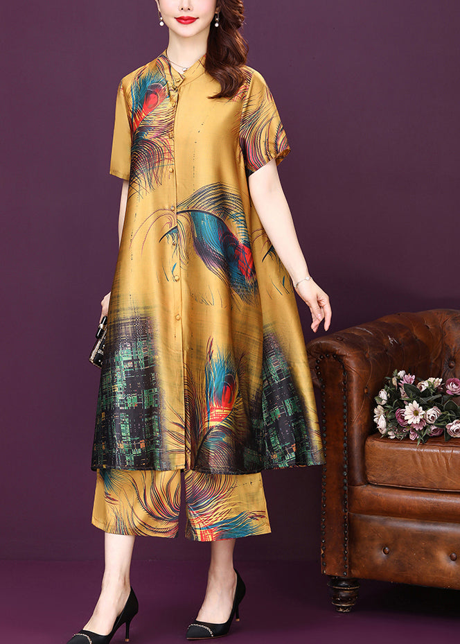 Yellow Button Print Silk Shirt Top And Pants Women Sets Two Pieces High Waist Summer