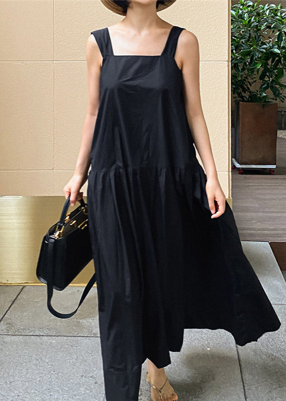 French Black Slash Neck Pockets Wrinkled Cotton Long Dress Sleeveless