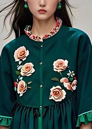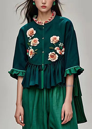 Natural Blackish Green Stand Collar Ruffled Floral Tops Summer