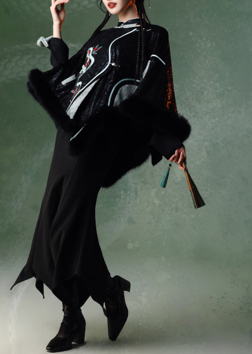 New Retro Black Embroidered Patchwork Serpentine Faux Suede Coat Winter