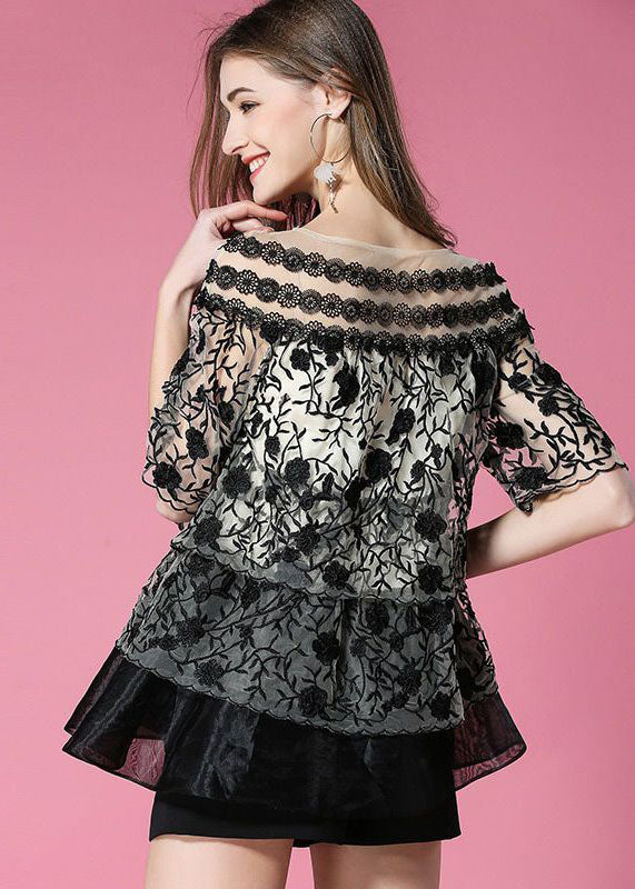 Casual Black O-Neck Embroideried Organza Tops Summer