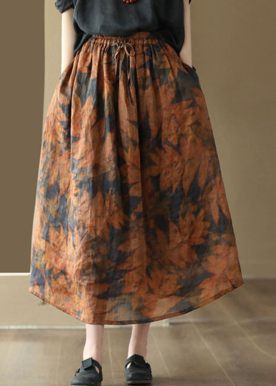Art Orange Wrinkled Print Elastic Waist Patchwork Linen Skirt Summer