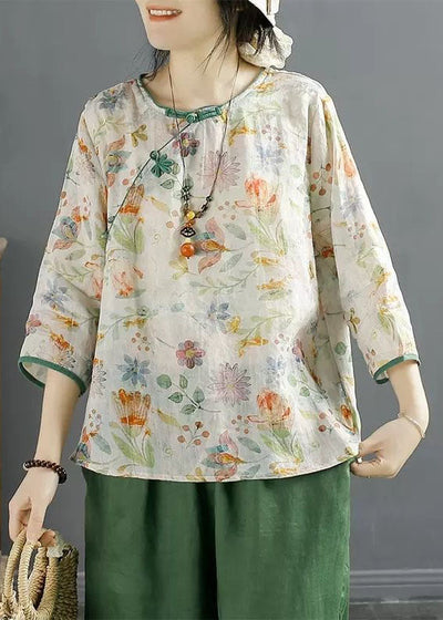 Fine Apricot O Neck Print Button Patchwork Linen Top Summer