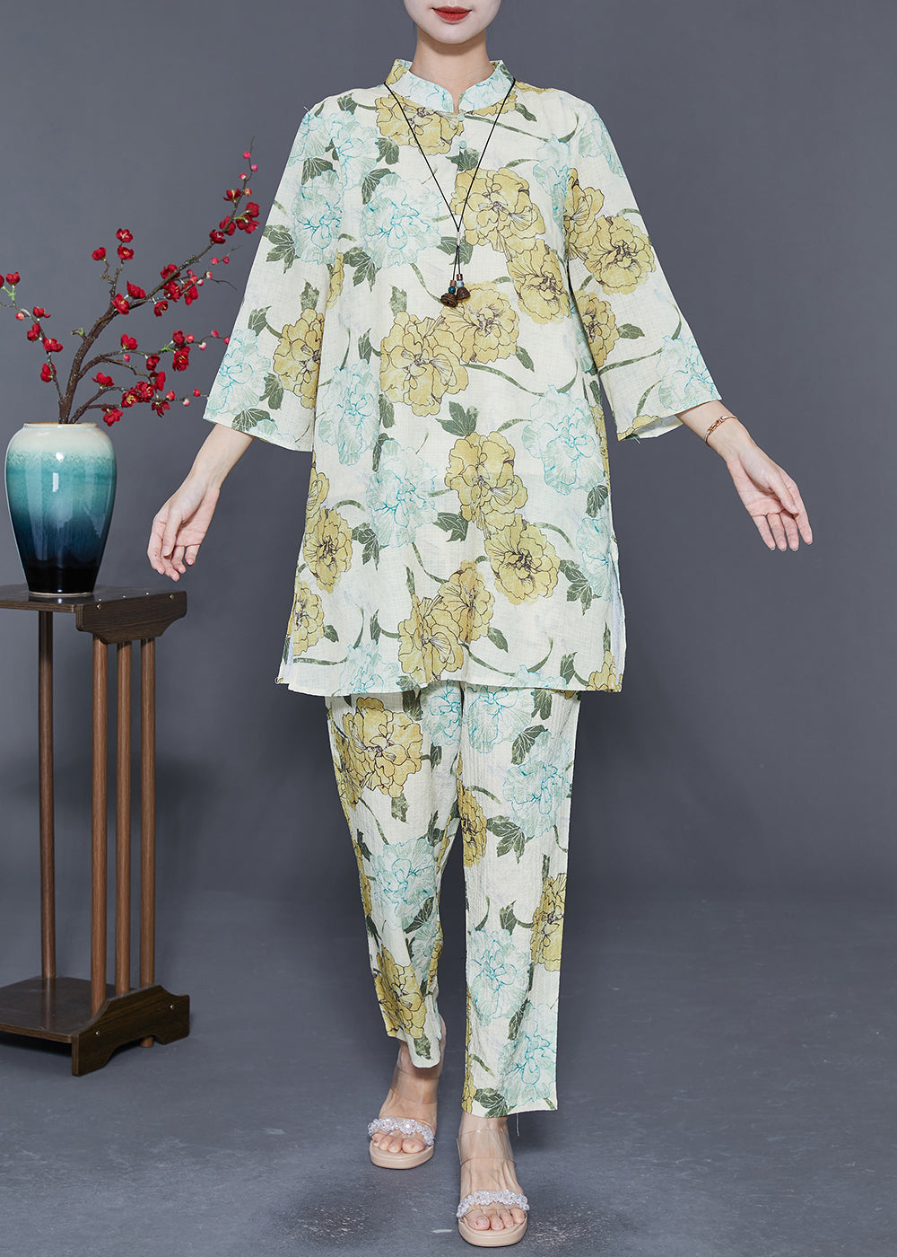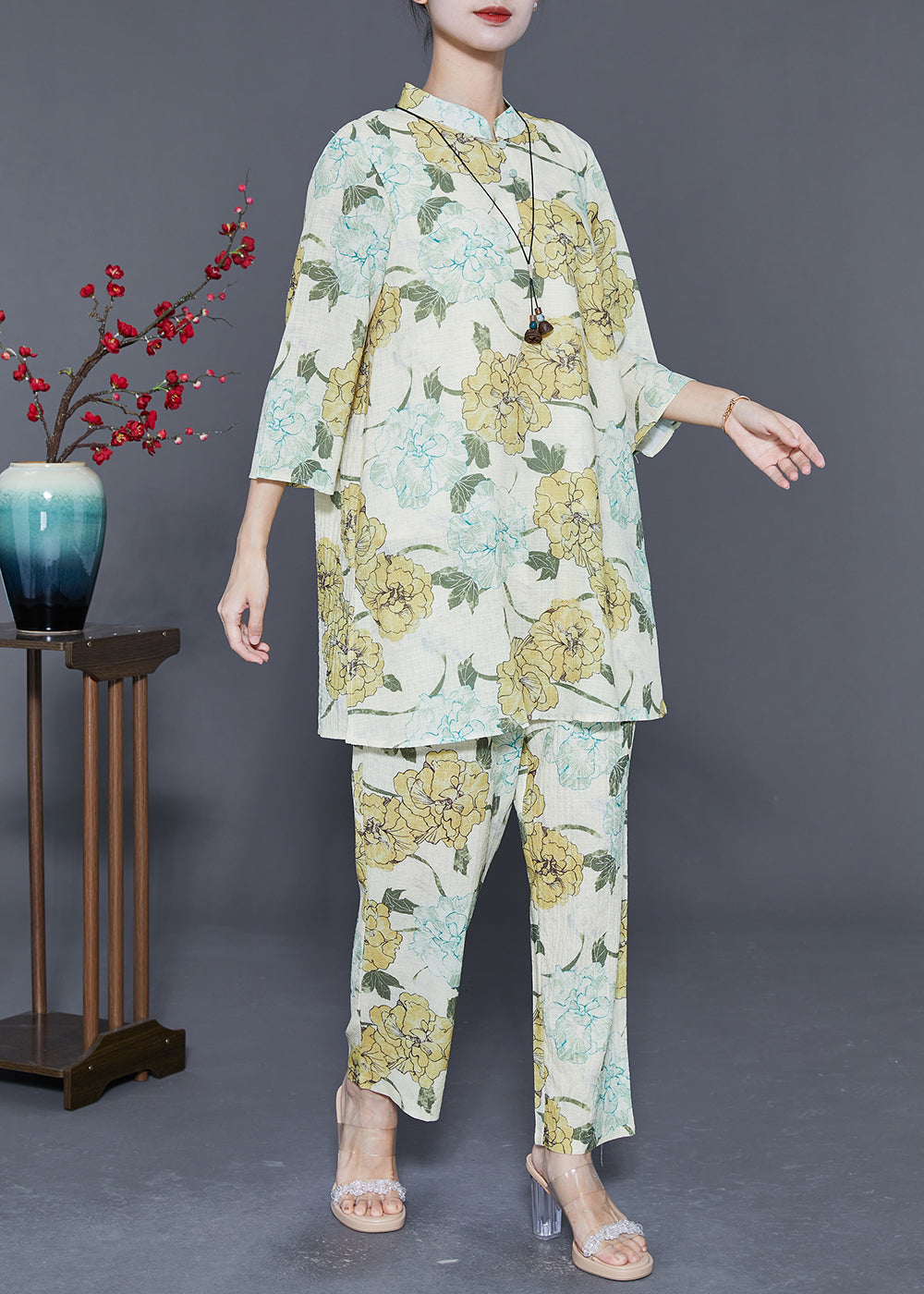 Art Apricot Oversized Floral Print Side Open Cotton Two Piece Set Outfits Summer