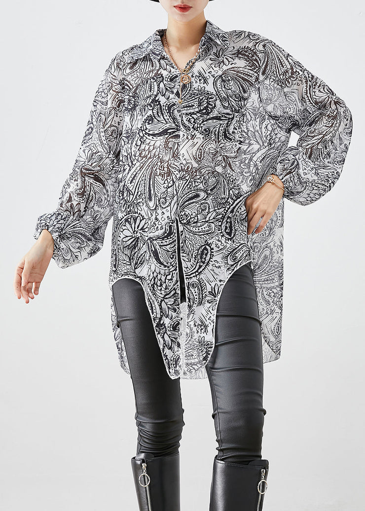 White Print Chiffon UPF 50+ Shirt Top Oversized Side Open Fall