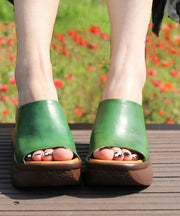 New Green Cowhide Leather Peep Toe Splicing Wedge Slide Sandals