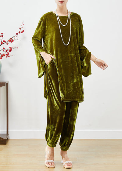 Boho Dull Green Oversized Side Open Silk Velour Two Pieces Set Fall