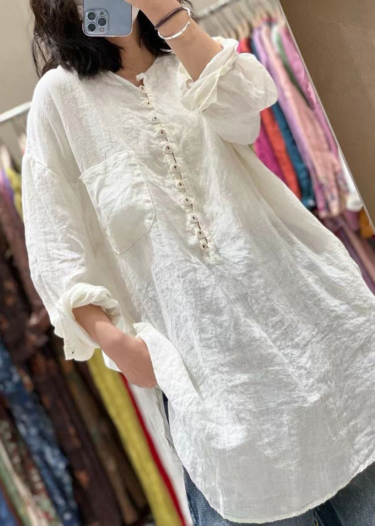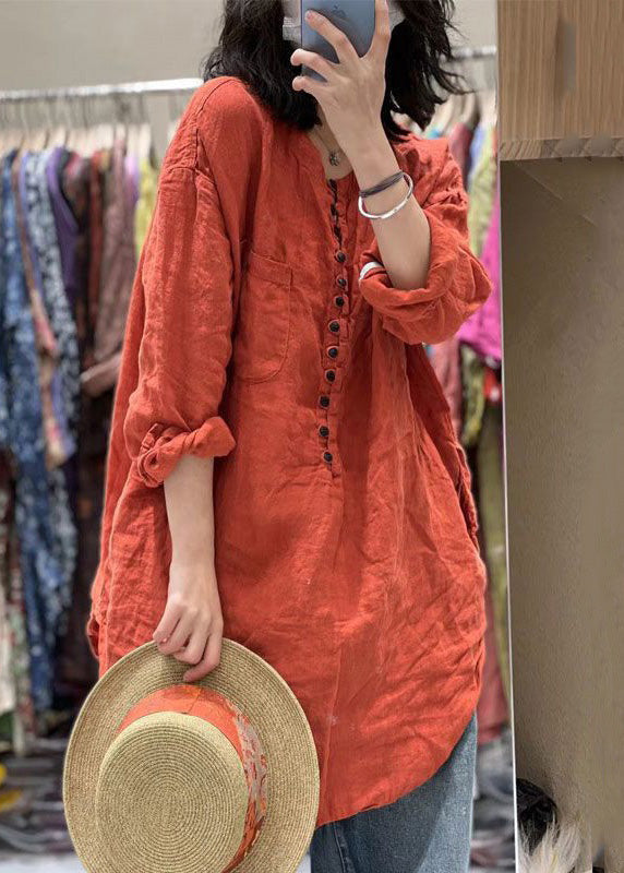 Women Orange Solid Button Pockets Cotton Top Spring
