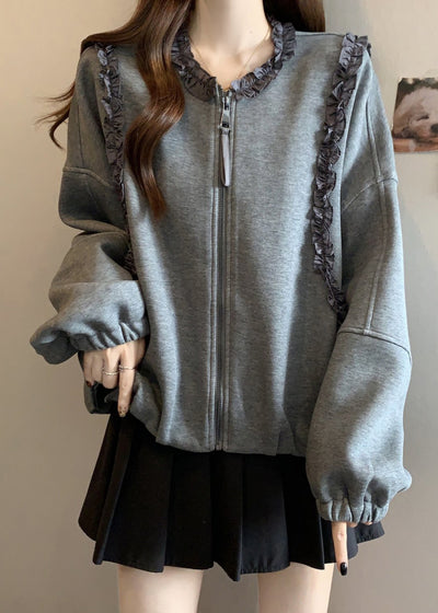 Loose Grey Ruffled Zippered Cotton Coats Fall