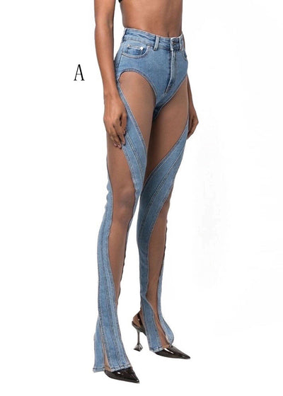 Sexy Hollow Out Tulle Patchwork Denim Trousers Fall