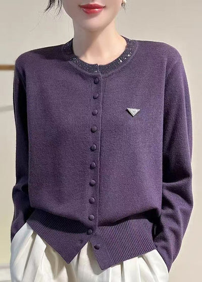 Slim Fit Purple O Neck Button Solid Knit Coats Winter