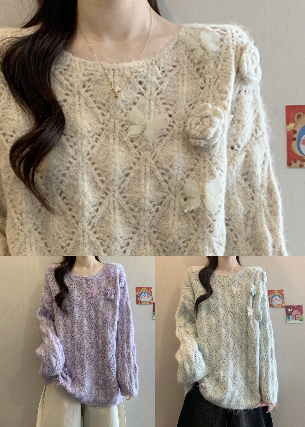 Loose Purple O Neck Butterfly Hollow Out Knit Sweater Fall