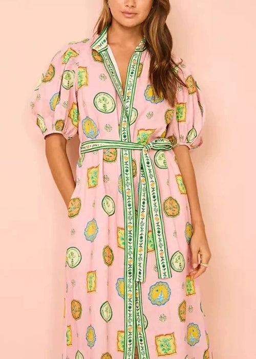 Elegant Pink Print Tie Waist Cotton Blouses Dresses Half Sleeve