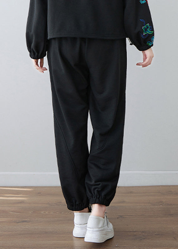 Black Embroideried Floral Pockets Elastic Waist Pants Fall