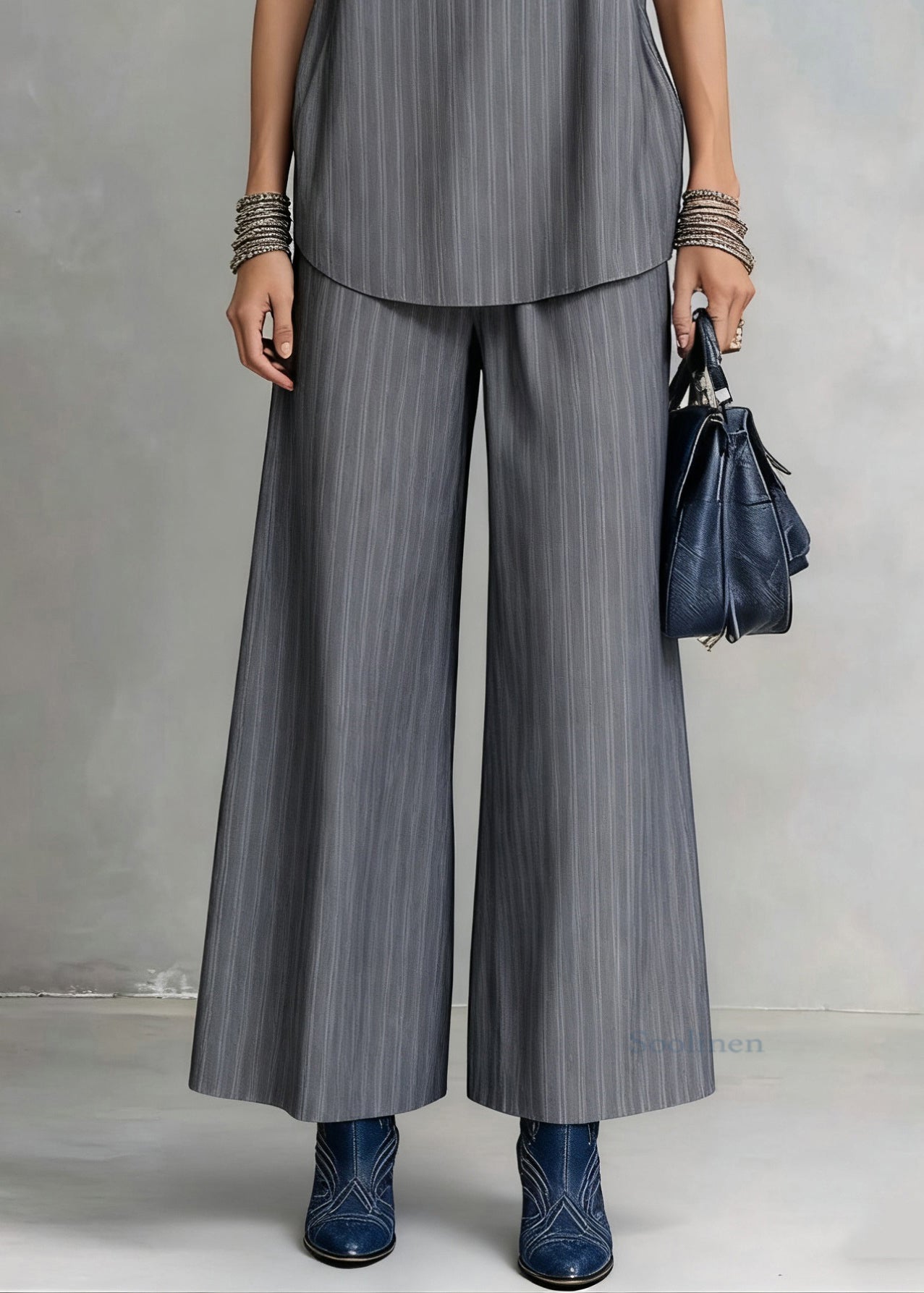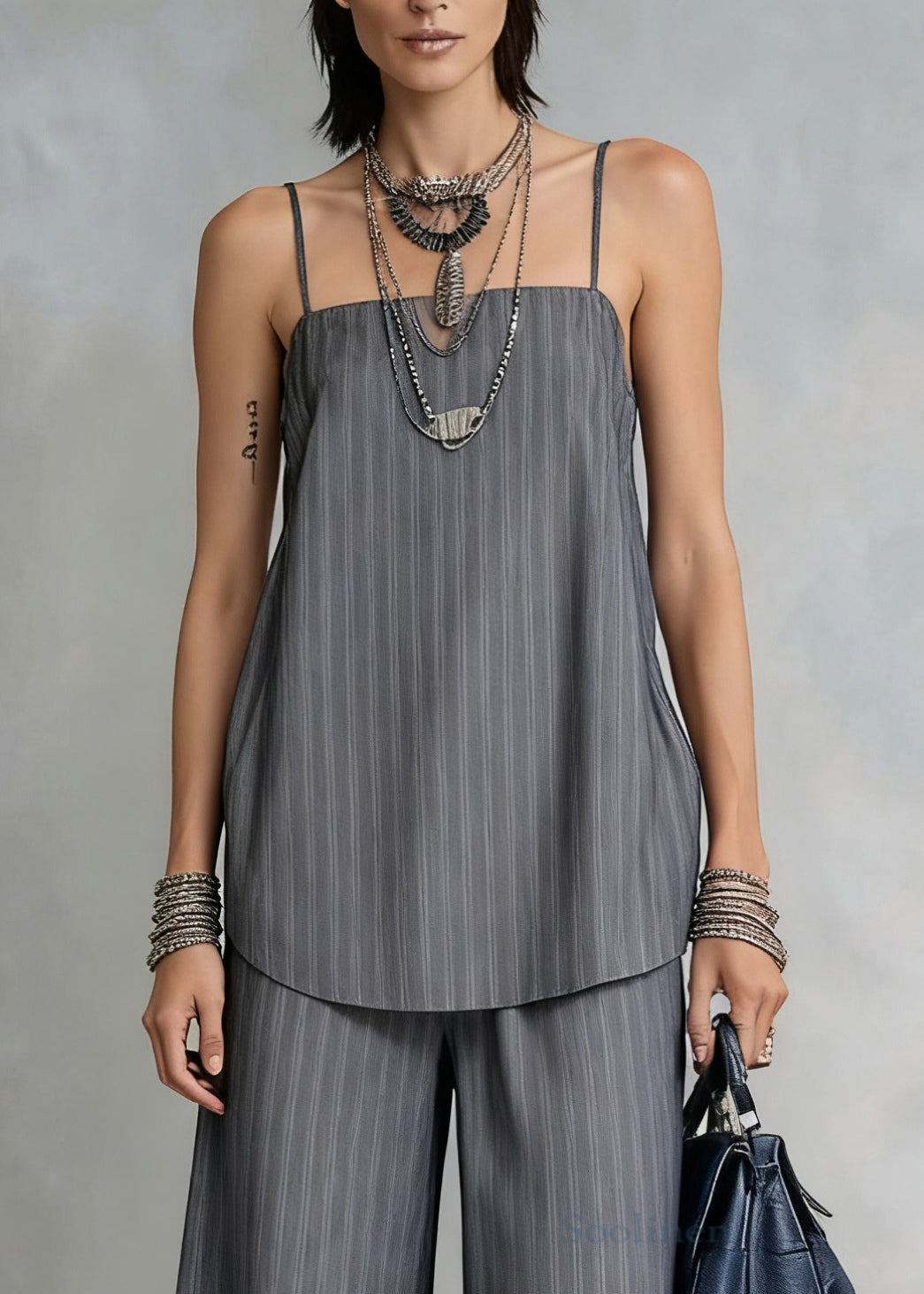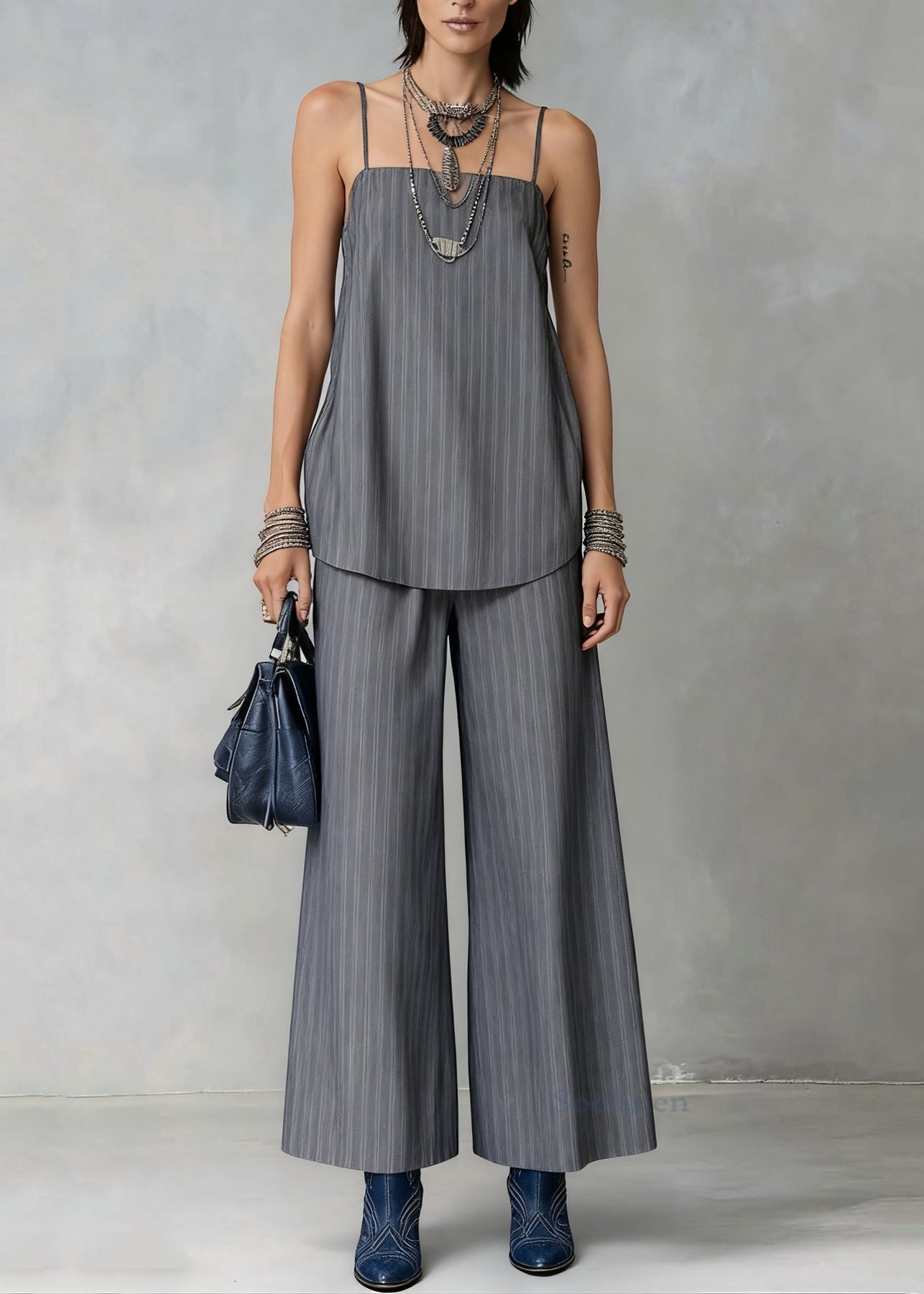 French Grey Striped Spaghetti Strap Tank And Wide Leg Pants Cotton Two Pieces Set Sleeveless